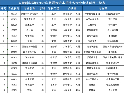 现公布《安徽新华学院2022年普通专升本招生各专业科目考试一览表》及《安徽新华学院2022年普通专升本考试招生专业课参考教材一览表》。