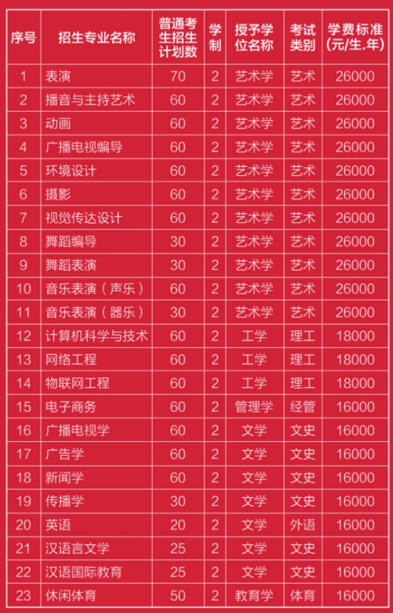 (六)学校概况:河北传媒学院是一所以传媒艺术为主,艺、文、工、管、教等多学科兼容的民办全日制普通高等学校。设有48个本科专业,3个专业硕士研究生专业。广播电视编导、录音艺术2个专业为国家级一流本科专业建设点,播音与主持艺术、网络与新媒体、戏剧影视美术设计、休闲体育、广播电视学、舞蹈编导、影视摄影与制作、视觉传达设计、表演、摄影10个专业为省级一流本科专业建设点,其中广播电视编导和播音与主持艺术同时为河北省综合改革试点专业。