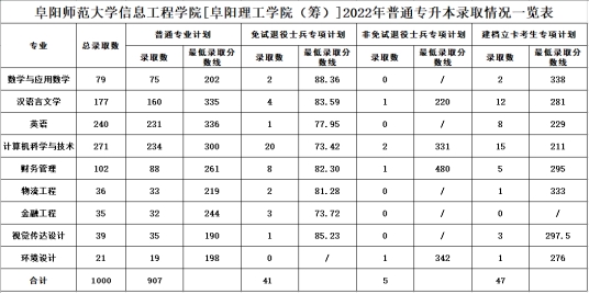 2022年阜阳师范大学信息工程学院专升本录取分数线