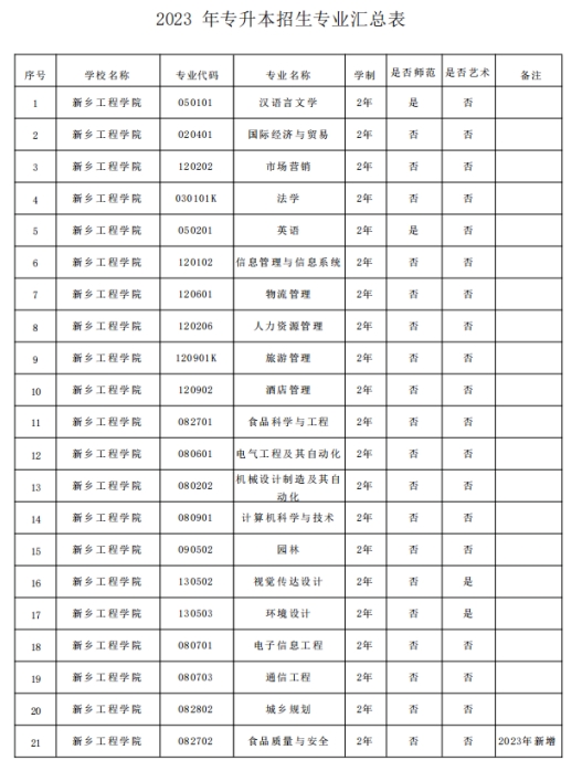 新乡工程学院(原河南科技学院新科学院),2023年专升本共21个专业面向全省招生,和2022年相比增加了食品质量与安全1个招生专业,报考代码6513,欢迎各位考生报考。最终招生专业和招生计划以上级主管部门批准为准。