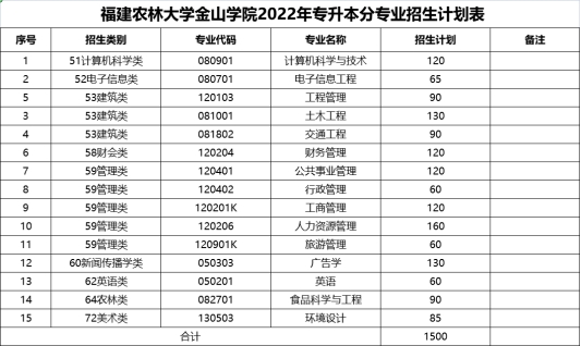 2022年福建农林大学金山学院专升本招生计划表