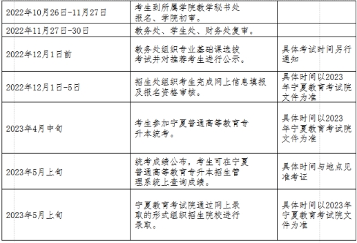 (二)各学院于 2022年12月1日前将《宁夏 2023 年普通高等教育专科升本科招生报名及志愿填报申请表》及《银川能源学院 2023 年专科升本科考试报名汇总表》报教务处教学运行科。