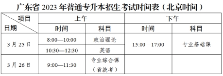 (四)普通专升本招生考试时间为2023年3月25日(星期六)至26日(星期日)两天,具体安排见下表: