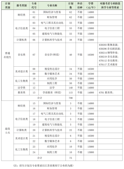 2.普通高职(专科)录取后及在校期间从江苏省应征入伍,退役复学后的三年级在校学生;普通高职(专科)毕业当年从江苏省应征入伍,退役一年内的毕业生(含服役期间取得毕业证的),经有关单位严格按照规定的标准和程序审核后可参加我校的退役大学生士兵免试“专转本”招生。
