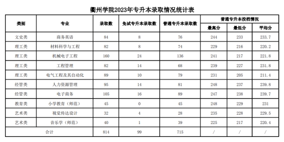 2023年衢州学院专升本录取分数线