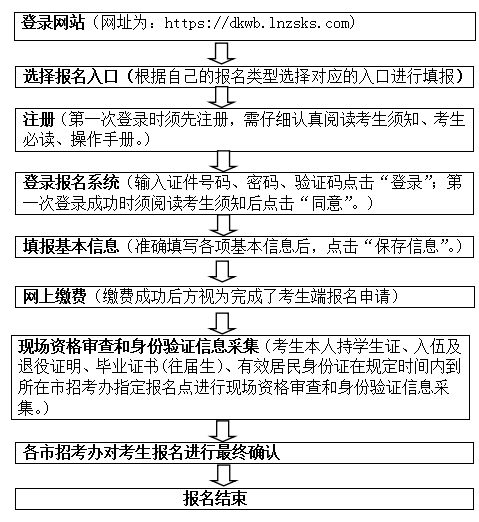 1.考生报名基本流程为:考生网上填报基本信息(网址为:https://dkwb.lnzsks.com)→网上缴费→现场资格审查和身份验证信息采集→各市招考办对考生报名进行最终确认。