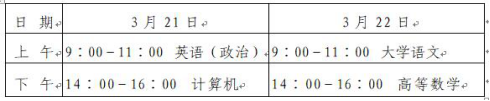 考试科目为4门公共基础课,包括英语(专科期间公共外语课程为非英语的考政治)、计算机、大学语文、高等数学(分为高等数学Ⅰ、高等数学Ⅱ、高等数学Ⅲ),每门科目考试时间120分钟、满分100分,总分满分400分。省教育招生考试院统一命题,统一考试,统一评卷。具体考试科目设置情况见附件3。各科考试时间安排如下: