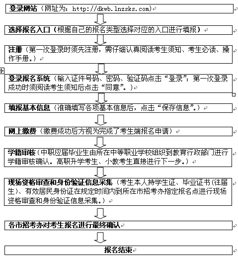 1.考生报名基本流程为:考生网上填报基本信息(网址为:http://dkwb.lnzsks.com)→网上缴费→现场资格审查和身份验证信息采集→各市招考办对考生报名进行最终确认。