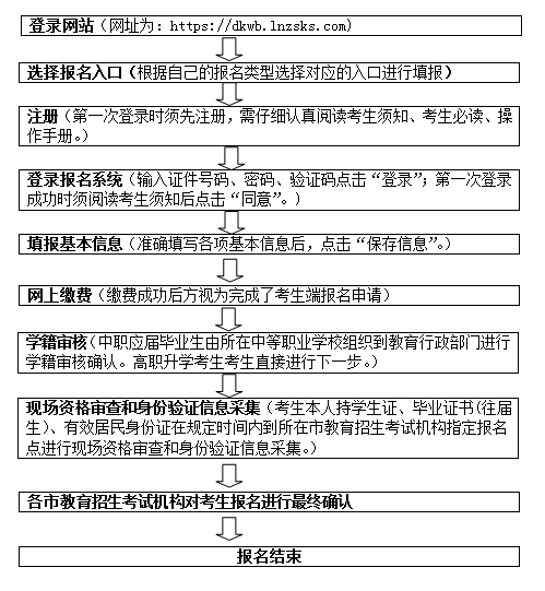 1.考生报名基本流程为:考生网上填报基本信息(网址为:https://dkwb.lnzsks.com)→网上缴费→现场资格审查和身份验证信息采集→各市教育招生考试机构对考生报名进行最终确认。