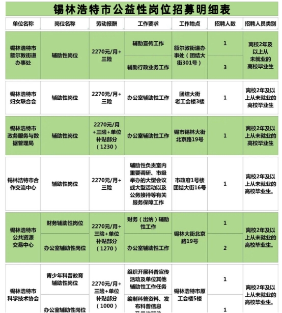 锡林浩特市计划开发公益性岗位136个,具体岗位信息请详见附件:《锡林浩特市公益性岗位明细表》。