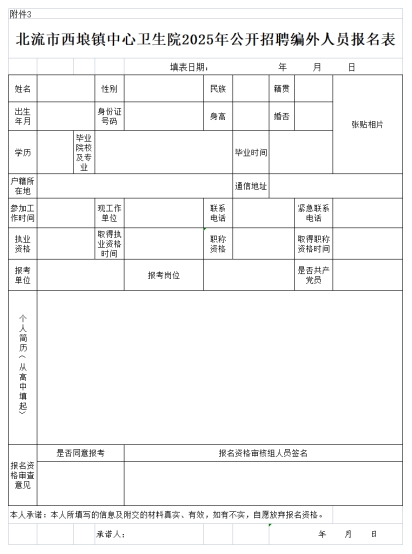 (2)《北流市西埌镇中心卫生院2025年公开招聘编外人员报名表》(附件3);