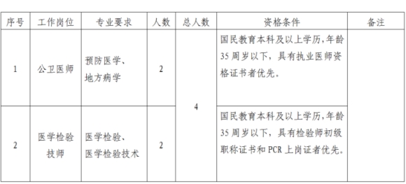 计划招聘公卫医师岗位2人、医学检验技师岗位2人,共计4人(详见附件),此次公开招聘面向全国范围进行。