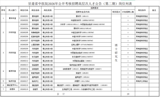 2026年3月,根据《事业单位公开招聘人员暂行规定》(人社部令第6号)、中央组织部、人力资源和社会保障部《关于进一步做好事业单位公开招聘工作的通知》(人社部发〔2024〕57号)文件精神,《甘肃省事业单位公开招聘人员暂行办法》(甘办发〔2011〕22号)、《关于加强和改进全省卫生健康人才引进工作的通知》(甘组通字〔2019〕64 号)、《关于省直事业单位引进高层次和急需紧缺人才相关工作的补充通知》(甘组通字〔2019〕111号)规定,结合医院实际需要,经医院研究决定开展“甘肃省中医院2026年公开考核招聘高层次人才公告(第二期)”工作,公开招聘高层次人才岗位19个,计划公开引进博士研究生20名。现将有关事项公告如下: