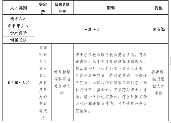 各类人才除享受按国家有关规定提供的工资、保险、福利待遇外,学校还提供其他人才待遇,详情参考下表。