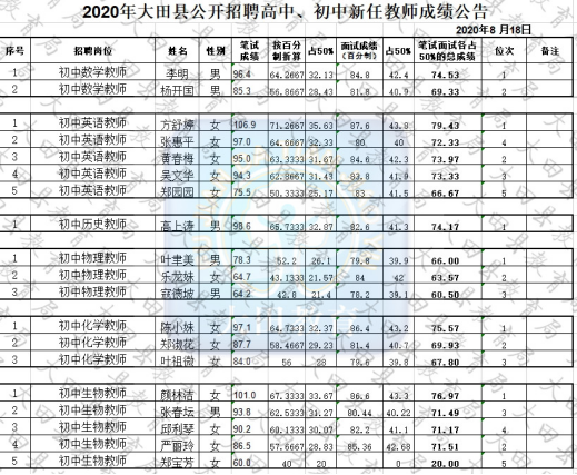 大田县2020年公开招聘高中、初中新任教师成绩公告
