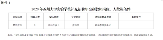 寄送地址:苏州市相城区高铁新城青龙港路33号 苏州大学实验学校 校务部(注明:应聘材料)。