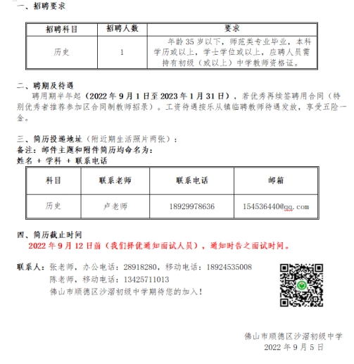 佛山市顺德区沙滘初级中学急招历史临聘教师