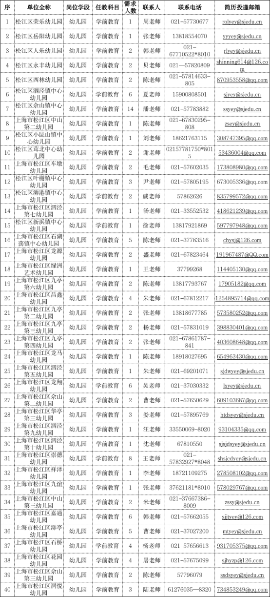 上海市松江区教育系统部分公办幼儿园储备教师(具体岗位名称及人数需求见附件)。