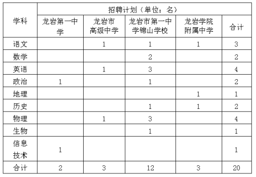 根据学校需求及引进生具体情况,由龙岩市教育局统筹安排在龙岩一中、龙岩一中锦山学校、龙岩市高级中学、龙岩学院附属中学工作。主要引进语文、数学、英语、物理、生物、政治、历史、地理、信息技术等学科教师。