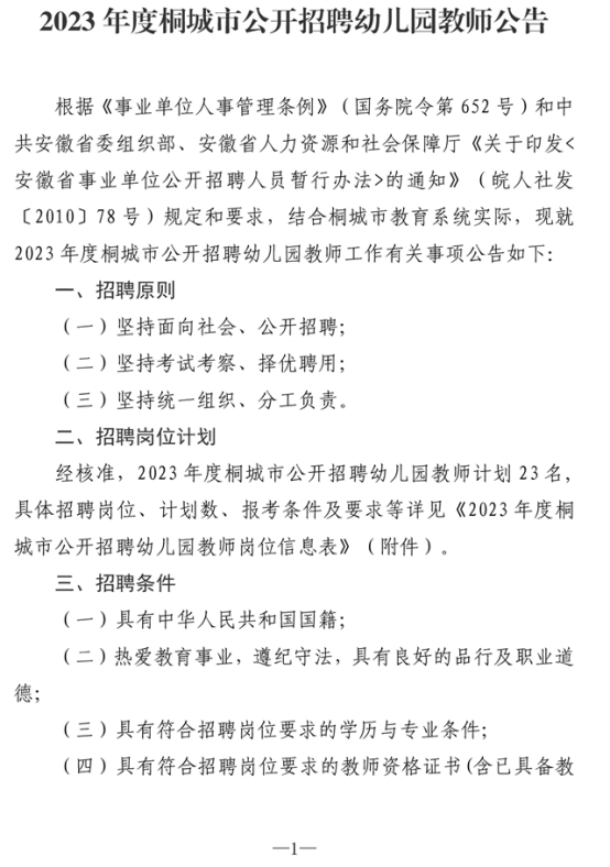 2023年度安徽省安庆市桐城市幼儿园教师招聘公告