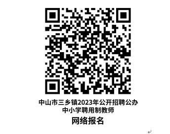 (1)网络报名:应聘者扫描下方二维码填写报名信息,下载并填写《三乡镇2023年公办中小学聘用制教师报名表》(附件2),将报名表的EXCEL电子版和PDF扫描版(本人签名)的压缩文件以“岗位代码+姓名”命名,发送至邮箱:zssxjyty@163.com。在规定时间未按要求发送报名资料的,视为无效报考(以邮件发送时间为准)。