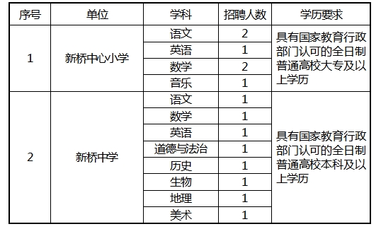 为适应新桥镇教育事业发展需要,经镇党委、镇政府研究同意,现面向社会公开招聘中小学编外教师14名。有关事项公告如下: