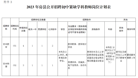 3、2023年房县公开招聘初中紧缺学科教师岗位计划表