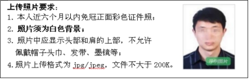 3.上传照片:照片将用于准考证以及考试合格证明,请考生上传照片时慎重选用。照片不合格的考生审核将不能通过。
