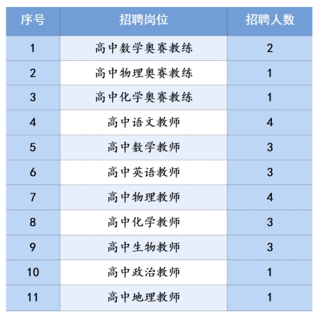 3、教师岗位要求:政治思想素质高,具有扎实的专业理论基础和过硬的业务技能,能够胜任班主任工作或能有效组织学生活动。数学、物理、化学、生物学科能够胜任奥赛教练的毕业生优先考虑。