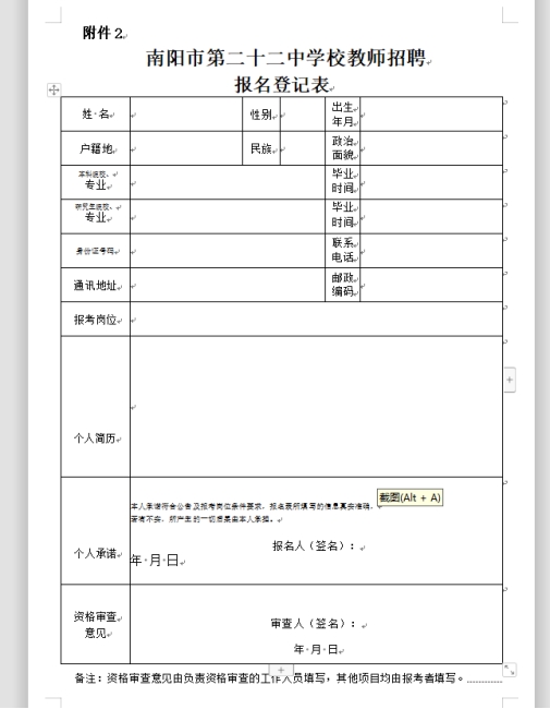 2.南阳市第二十二中学校教师招聘报名登记表