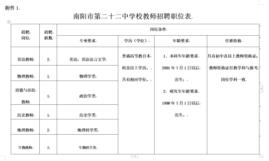 附件:1.南阳市第二十二中学校教师招聘职位表