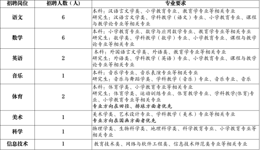 小学部两主一参教师:语文6人,数学6人,英语2人,音乐1人,体育(田径、排球)2人,美术(国画)1人,信息技术1人。专业要求见附件。