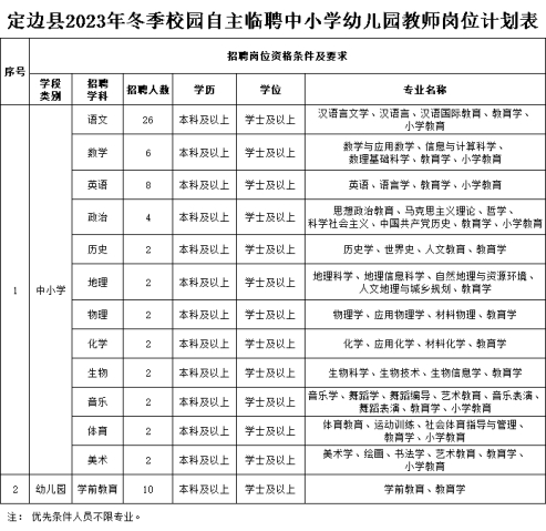 定边县2023年冬季校园自主临聘中小学幼儿园教师公告