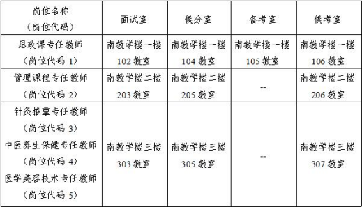 管理课程专任教师(岗位代码2)、针灸推拿专任教师(岗位代码3)、中医养生保健专任教师(岗位代码4)、医学美容技术专任教师(岗位代码5)面试采取专业提问的方式进行,由随机抽签产生的第1号面试考生作为抽题的代表,在备选题中随机抽取一套题,同一岗位考生均提问同一套题。面试内容主要测试考生的学科素养、业务能力、综合素质、应变能力等。面试时间为20分钟/人。