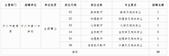按照事业单位公开招聘工作人员有关文件规定,根据增人计划和招聘单位编制、岗位空缺及教师队伍结构情况,经市委、市政府同意,通过校园招聘方式,面向全国本科院校2024年本科及以上学历学位应届毕业生(含公费师范生,不含定向及委培生),为忻州市第一中学校招聘教师26名,现公告如下:
