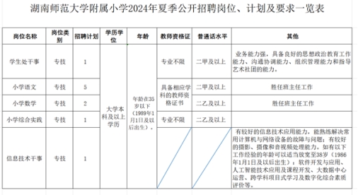 湖南师范大学附属小学始建于1953年,由湖南师范大学主办,文化底蕴深厚、校园环境优美,是长沙市首批示范性完全小学。学校师资实力雄厚,办学成绩卓著,是一所享誉三湘的优质基础教育品牌学校。为进一步优化教师结构,加强我校师资力量,现面向社会公开招聘非事业编制工作人员,具体公告如下: