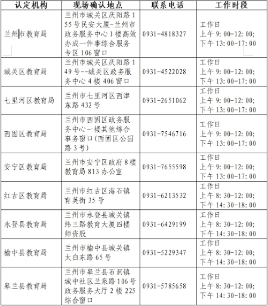2.幼儿园教师资格、小学教师资格和初级中学教师资格的认定机构为申请人户籍、居住地或就读学校所在地县(区)教育局(其中:兰州新区范围内人员由皋兰县教育局认定、兰州高新区范围内人员由之前行政辖区所属县区教育局认定)。