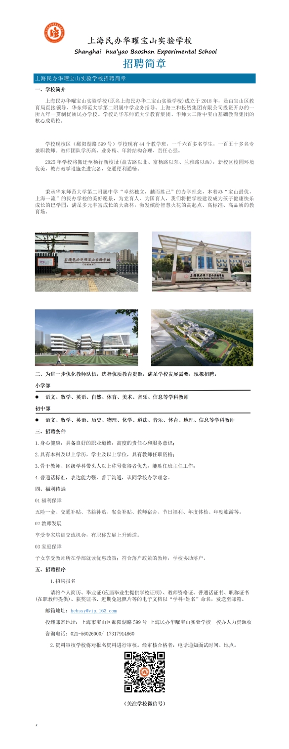 上海民办华曜宝山实验学校2024年秋季教师招聘简章