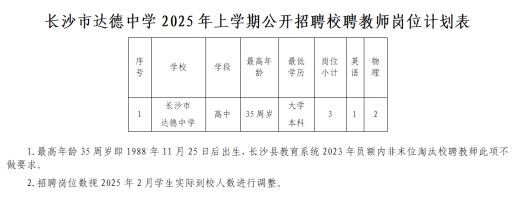 本次招聘岗位计划详见附件1《长沙市达德中学2025年公开招聘校聘教师岗位计划表》。