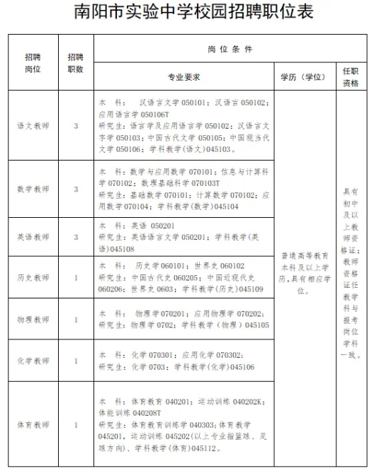 招聘信息通过南阳市实验中学微信公众号(南阳市实验中学)、高校校园招聘现场进行发布。