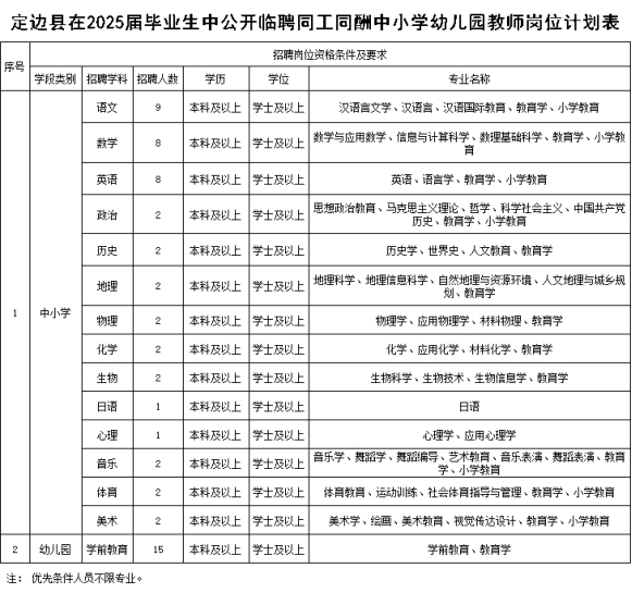 7.专业要求:基本条件人员专业须满足《定边县在2025届毕业生中公开临聘同工同酬中小学幼儿园教师岗位计划表》要求;优先条件人员不限专业。