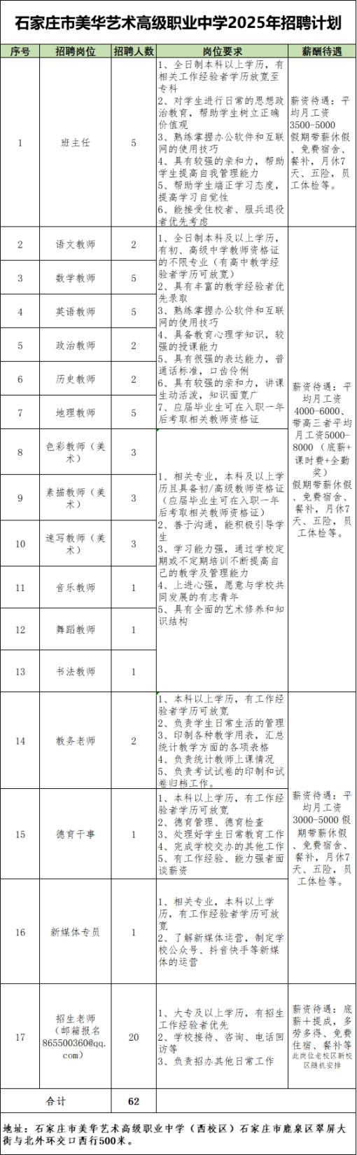 石家庄市美华艺术高级职业中学2025年公开招聘教师及工作人员公告