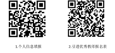 请用微信扫描下方“1.个人信息填报”二维码在线填报相关信息,扫描下方“2.引进优秀教师报名表”二维码,下载并填写完整后,并携带身份证、毕业证书、所获荣誉与其它能说明个人业绩的材料原件与复印件,于2025年2月14日--2025年2月28日11:00间(工作日)到教育局人事科二完成现场报名。