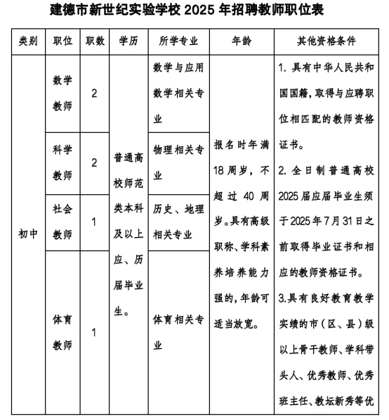 本次拟招聘教师6名,其中初中数学教师2名、初中科学教师2名、初中社会教师1名、初中体育教师1名。具体详见下表:
