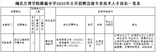(一)湖北文理学院附属中学拟公开招聘急需专业技术人才1名。岗位条件详情见《湖北文理学院附属中学2025年度公开招聘急需专业技术人才岗位一览表》。
