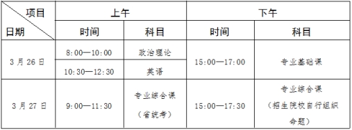 专业综合课分省统一命题和院校自行命题两种。部分专业(具体专业见附件7)的专业综合课实行省统一命题考试,其他省级统考没有覆盖的专业,招生院校可选择用相近的省统考专业综合课替代,也可自行组织命题。招生院校自行组织命题的专业综合课在省招生办规定的统一时间举行考试,考试时间安排在省统考科目后。