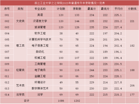 浙江工业大学之江学院2023年专升本录取公告 我院2023年专升本招生总计划1160个,实际录取1276个,我院专升本录取工作圆满结束。其中,免试专升本实际录取74个,普通专升本一次性完成所有招生计划,实际录取1202个(同分带入116个),专升本整体生源质量同比2022年稳中有升。 普通专升本各专业投档情况如下: