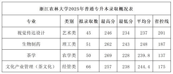 浙江农林大学2025年普通专升本拟录取分数线