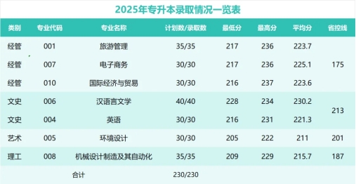 学院2025年专升本招收电子商务、国际经济与贸易、旅游管理、汉语言文学、英语、环境设计和机械设计制造及其自动化7个专业,计划数230名(其中退役士兵免试计划10名),最终录取230名(其中退役士兵免试计划8名)。具体计划执行情况详见下表: